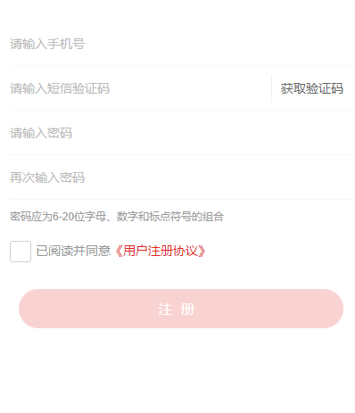 打开应用,进入登录中心;没有账号的用户可以点击注册,输入手机号密码、短信验证码、密码和勾选用户注册协议,即可注册账号成为新用户。下图所示: