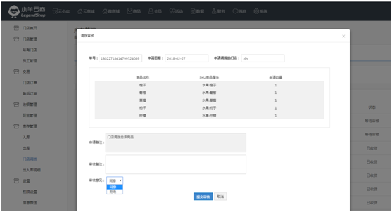 (1) 当门店售卖的商品不足时。可自主向商家申请调拨。商家通过审核调拨单决定是否将商品调拨给门店。