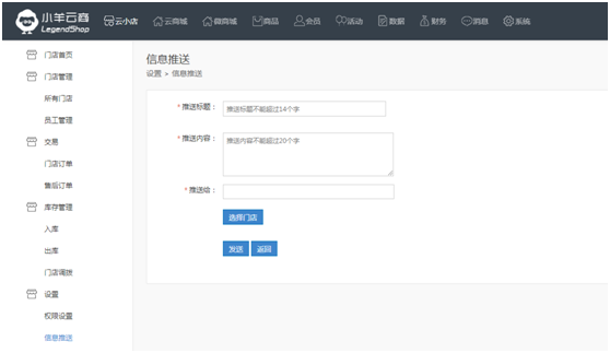 (1) 依次点击“信息推送”“新信息推送”可对下级门店进行新信息的全体发送:便于有商家有新的改动或者优惠活动能方便的通知下级门店