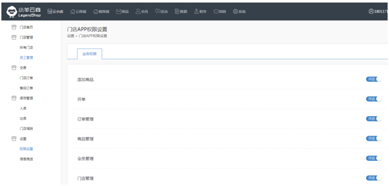 (1) 对于下级门店的管理,需要设置一定的权限,可以开启和关 闭响应的权限,如门店添加商品、是否可以调拨、是否可以线下代客下单等