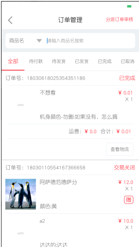 (1) 点击“订单管理”,可查看并筛选全部订单/待付款订单/待发货订单/已发货订单”: