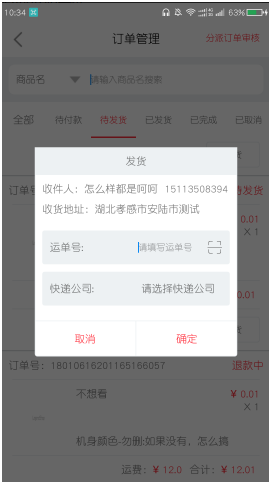 (1) 进入订单管理界面,选择待发货订单,选择需要发货的订单并点击“发货”,如果需要物流,那么需填写物流运单号(也可扫描快递单号条形码读取)和选择物流公司