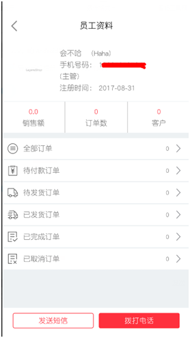 (1) 依次点击“员工管理”-员工 可以查看员工的销售额,订单数,跟推广的客户,及相关的订单详情