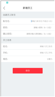 新增员工:依次点击“员工管理”“新增员工”进入新增员工操作界面,设置 该员工的帐号名密码、输入该员工的姓名手机号和所分配的角色,点击“保存” 即可成功新增员工: