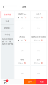 (1) 开单操作:依次点击“开单”“选择商品”点击“结算”提交跳到支付页面,其中选择现金支付的话,订单包含的总店商品的订单项的金额会记录到钱箱,用于跟商家结算。