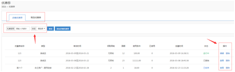在活动-活动管理-优惠券中我们设置了优惠券管理列表,管理列表支持礼券名称和礼券状态检索,商家可以看到店铺发布的各种优惠券,并可以根据需求对优惠券进行撤销下线,注意,一旦活动撤销了只能重新发布新的优惠券。