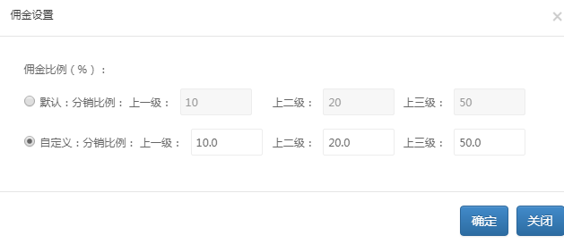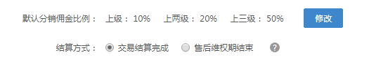 注:如果商品级采用"默认"方式,后台规则全局佣金比例修改的话,所有采用"默认"方式的商品将同步修改佣金比例。
