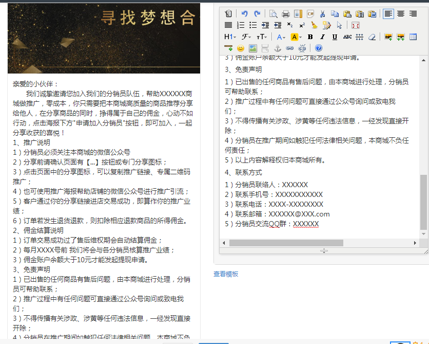 为了减轻商家编辑招募海报的负担,系统已提供了一套默认招募计划模板,商家可以直接使用默认模板,做一些简单的调整,或者完全自定义编辑一套招募计划,为了招募海报的美观性,商家可通过编辑器的图片功能,从图库选择配图,以达到更佳的效果。
