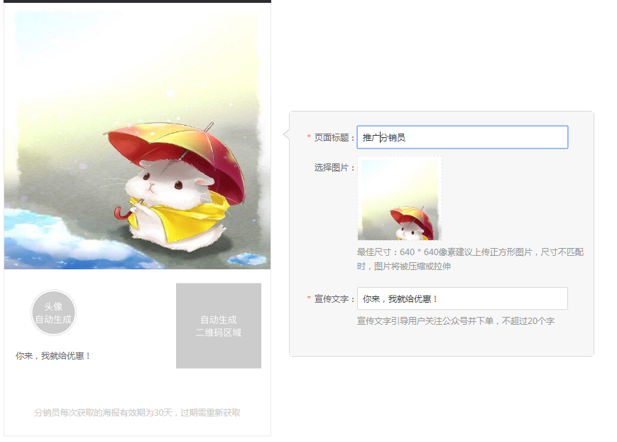 图中,商家需要设置分销海报页面标题,一句话海报宣传文字,头像区域和二维码区域为系统自动生成各推广员的数据。