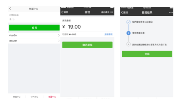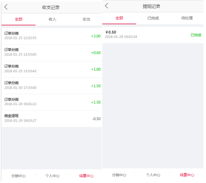 点击“立即提现”或者“结算中心”,申请提现,佣金的收支明细可以查看到订单的结算情况,提现流水可以看到您之前的历史提现记录