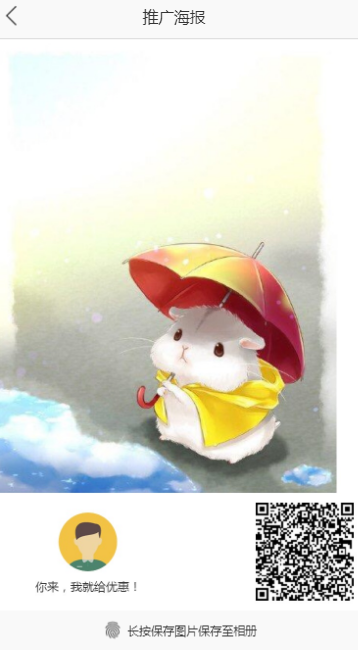 点击”推广海报”按钮,进入推广海报页,分销员可以直接保存海报图片,分享到朋友圈或者微信群,也可以直接打印出来进行线下的推广。