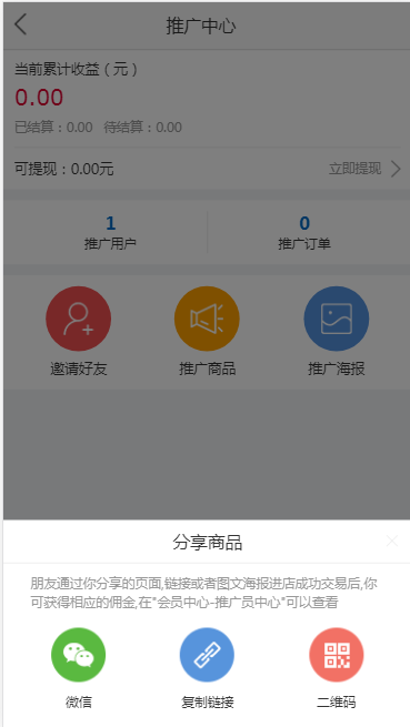 3)常用快捷菜单(邀请好友、推广商品、推广海报)