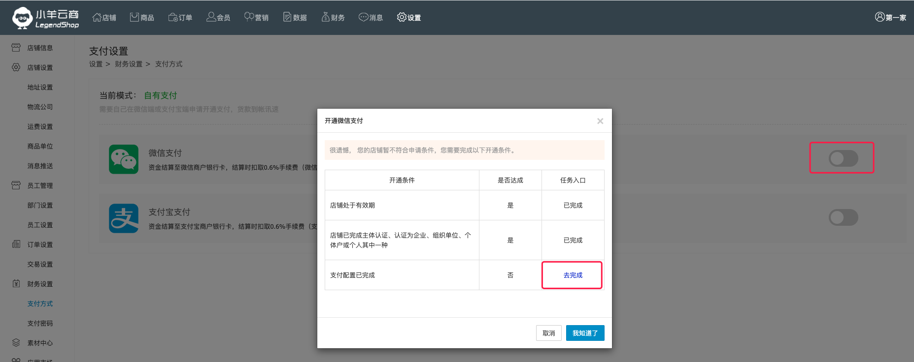 5.1设置支付方式为微信自有支付(需商家已拥有微信支付功能,如果您还未申请微信支付,需要申请通过后才能使用,点此了解详情)