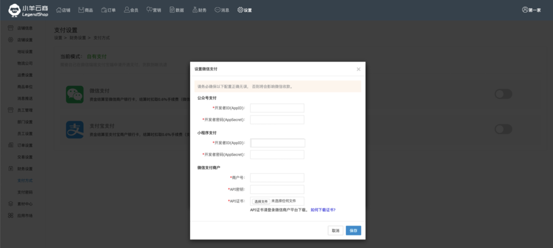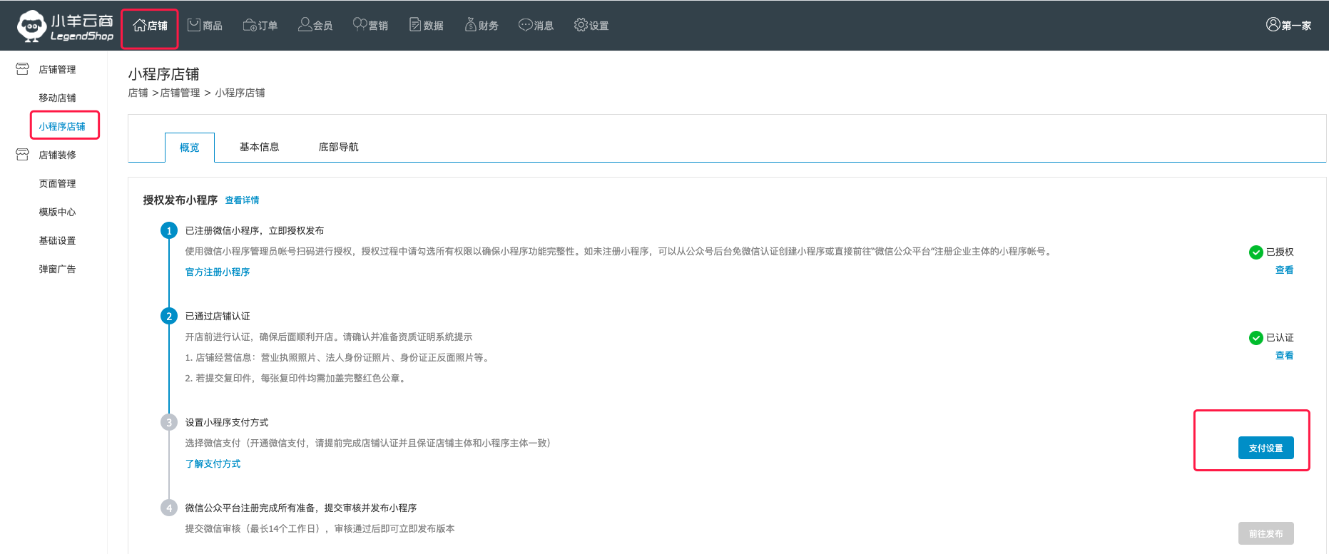 操作路径:小羊云商电脑端后台-店铺-小程序装修-概览-支付设置