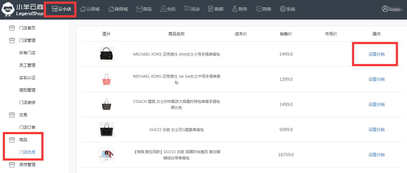 1.门店可以指定商品进行分销,设置路径:云小店