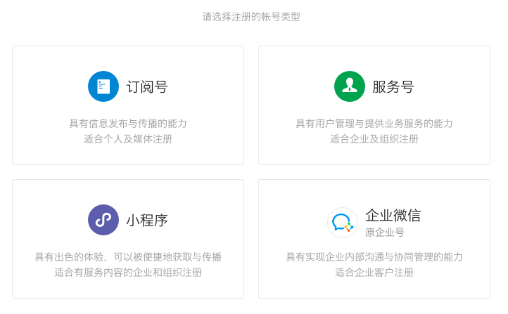 微信公众平台上可以申请注册的应用有:订阅号 服务号 小程序 企业微信,每种应用有不同的特色以及适合不同的人群。