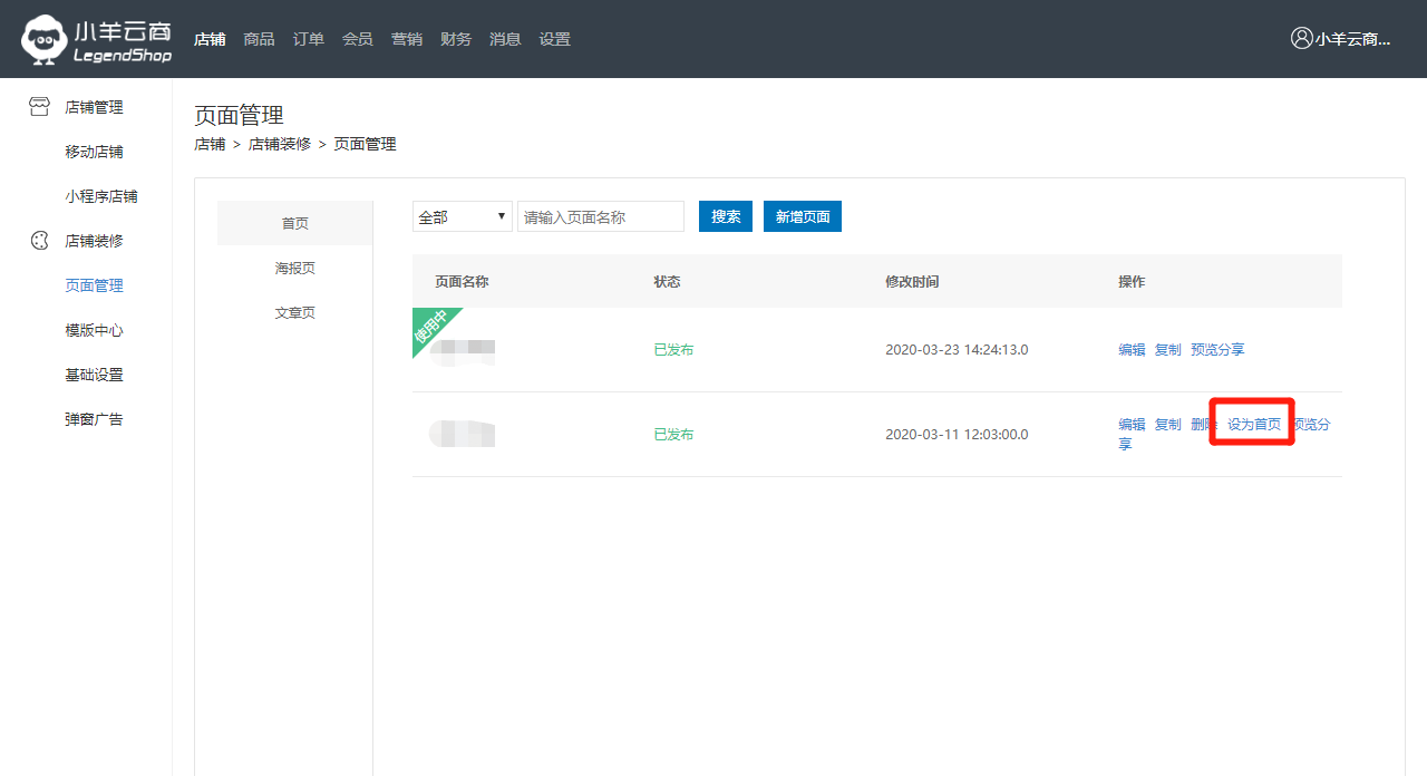 店铺—店铺装修—页面管理