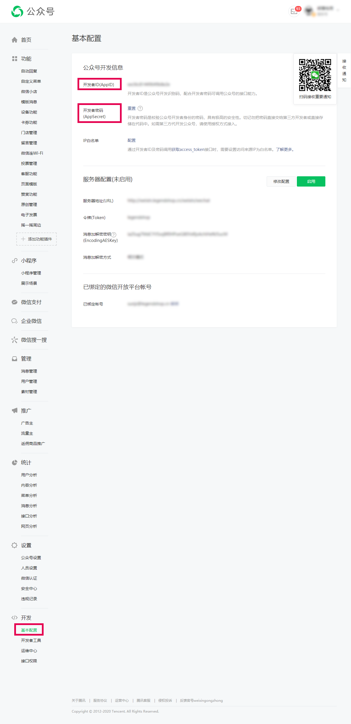 登陆微信公众号后台-基本配置即可查看;(AppSecret生成后只能看一次,需保存起来)