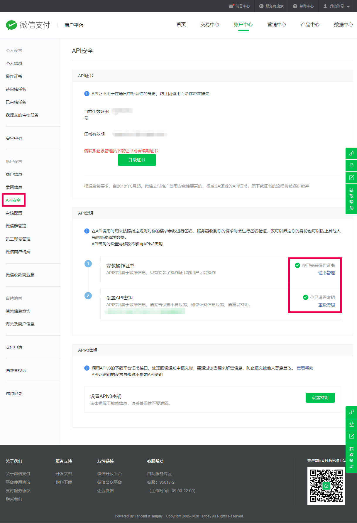登陆微信商户平台-账户中心-API安全-API密钥即可查看。(API密钥生成后只能看一次,需保存起来)注意:需要的是API密钥,不是APIv3密钥;