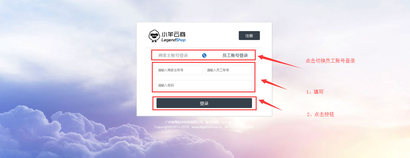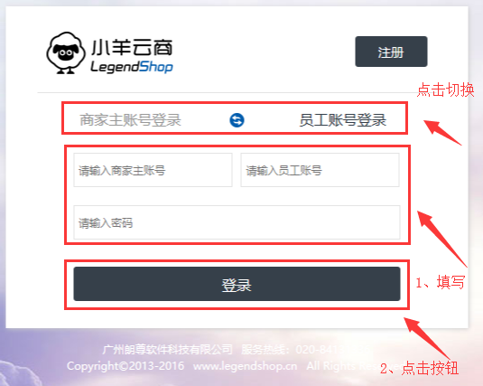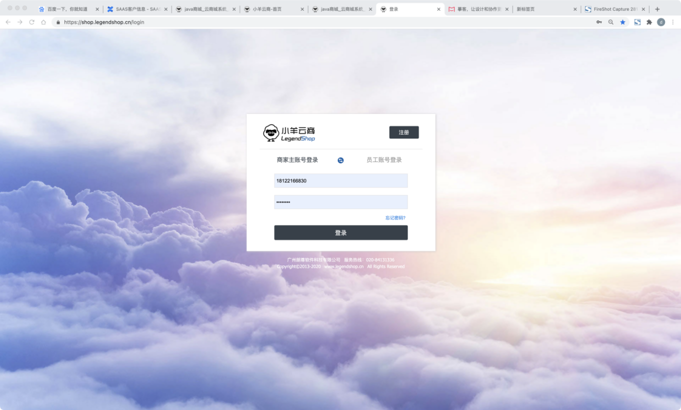 小羊云商采用账号密码的方式进行登录,登录身份可为商家和员工账号;员工账号需要商家手动增加