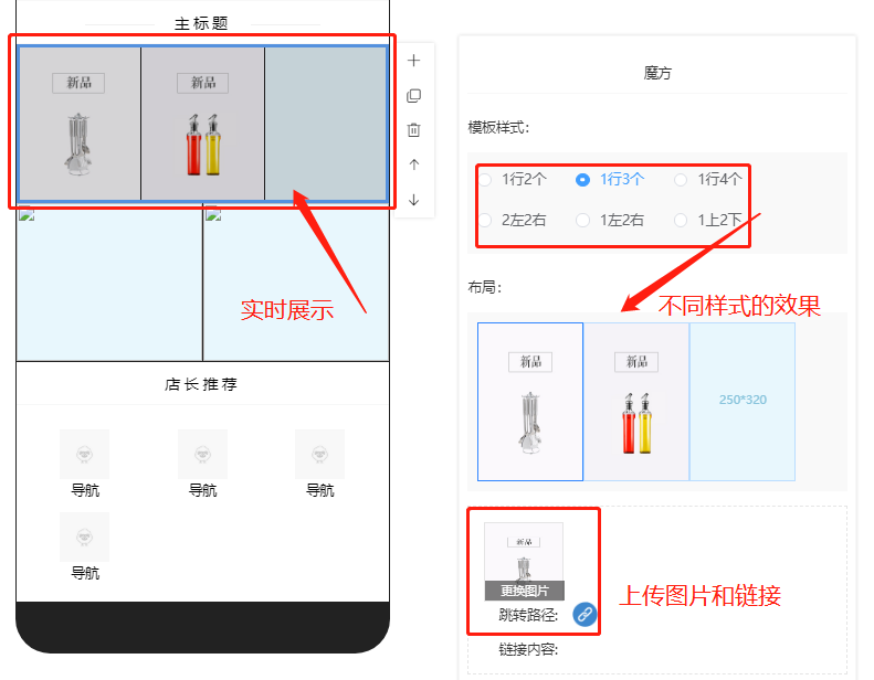 3.魔方:页面展示商品宣传或广告宣传,需要设置的内容为图片以及跳转链接