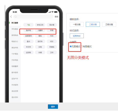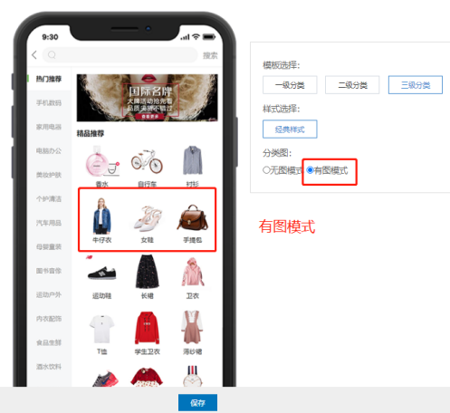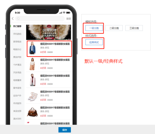 商家可设置商城分类页的展示级别,有一级分类样式(经典样式,有商品图片名称和价格),二级和三级分类(只有分类名称,可选有图和无图模式),商家需要根据需要进行设置。
