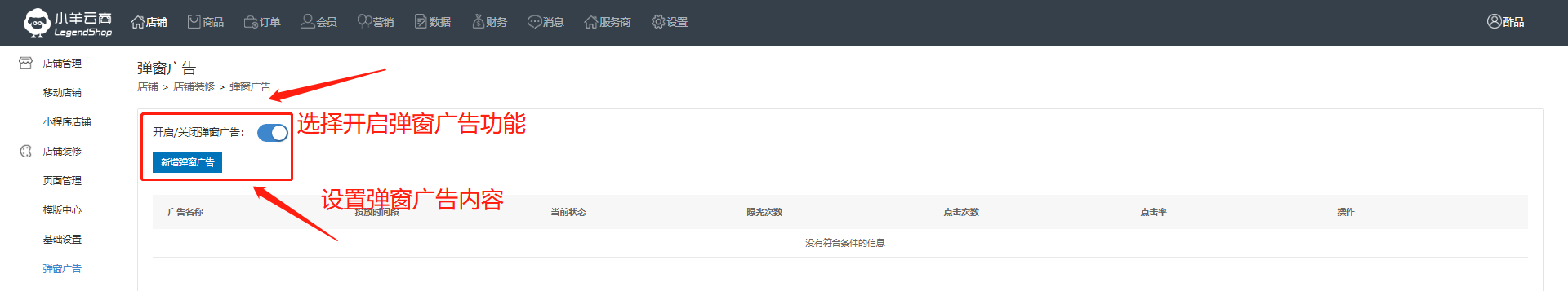 弹窗广告可以在不同的场景使用,如首页弹窗,新用户进入页面弹窗都可以设置的弹窗内容。商家先设置开启弹窗,然后新建弹窗,设置完成后,系统会根据商家的设置生效。以下为操作引导页面。