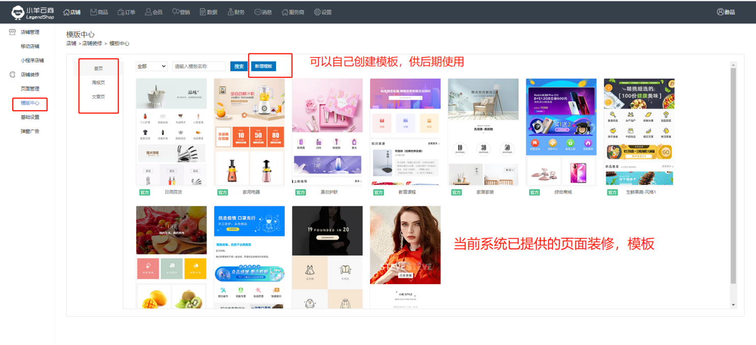 小羊云当前已有多种模板供商家使用,商家可以在模板基础上进行编辑和更改;另外也可以自己创建模板。