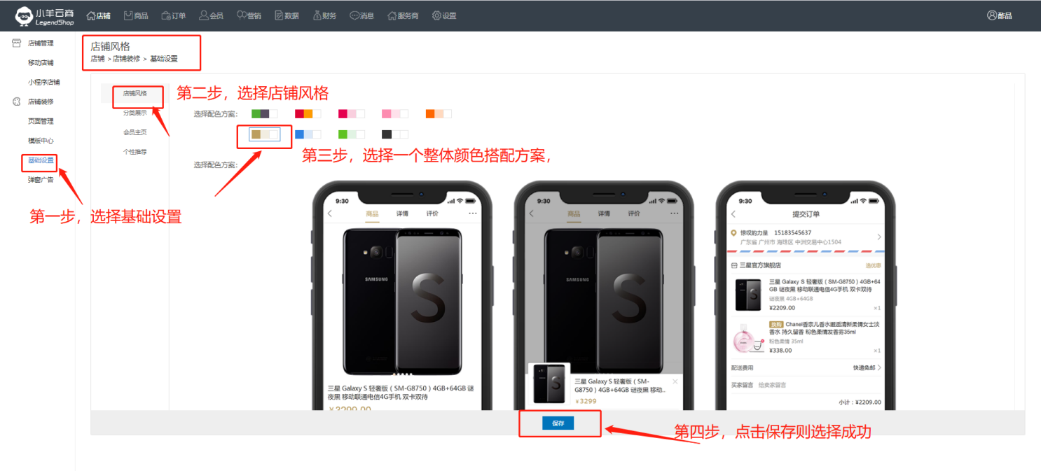 基础装修流程为四个步骤:店铺风格选择、分类页展示设置、会员主页设置、个性推荐展示设置,以下为每一个内容的解释以及操作步骤演示。