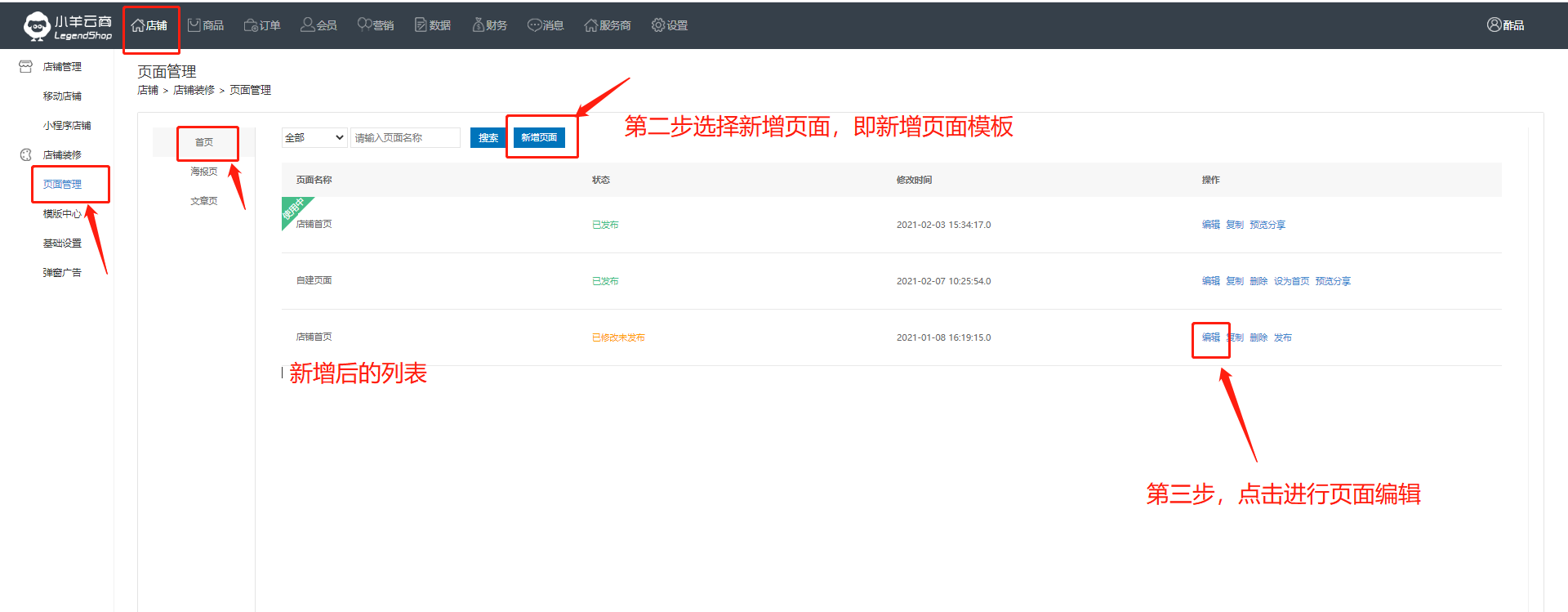这三个页面设置流程都一样:新增页面→选择模板→编辑页面→保存→发布