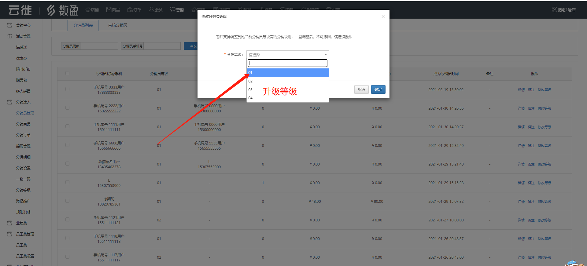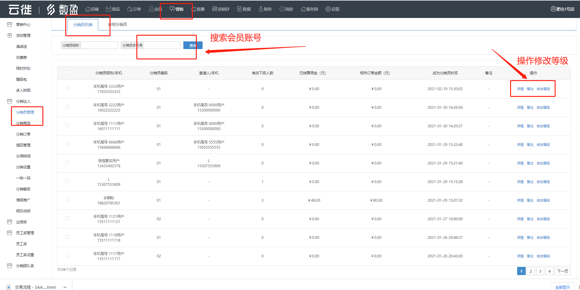 商家可以看到商城所有分销员的情况,列表内容数据包括邀请人手机号、已累计消费订单额、已累计获得佣金、修改等级等更多详情资料。