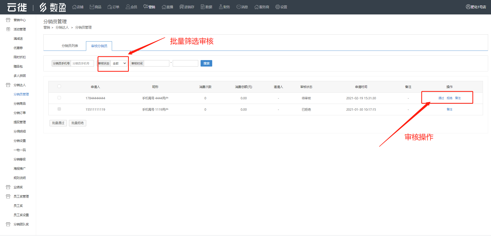 商家设置成为分销员方式中如选择【申请】,则当有用户申请成为分销员时,商家需要在这个页面的列表中审核通过还是拒绝。同一个手机号,只要还没有成为分销员,商家拒绝成为还可以多次申请成为分销员。