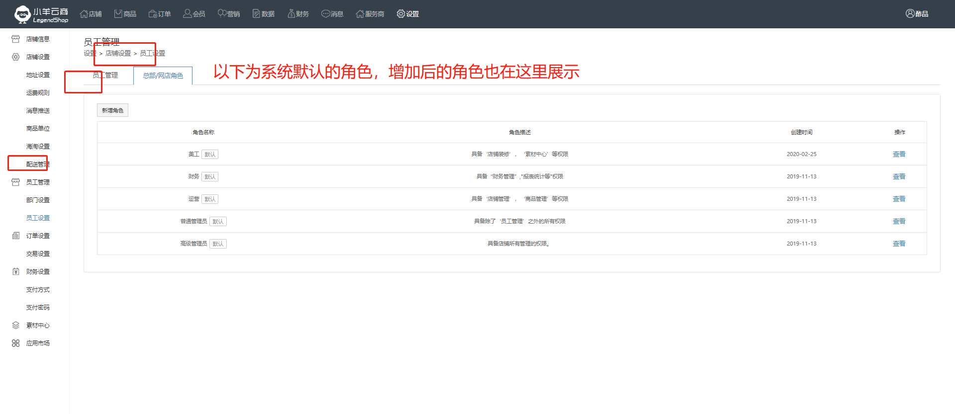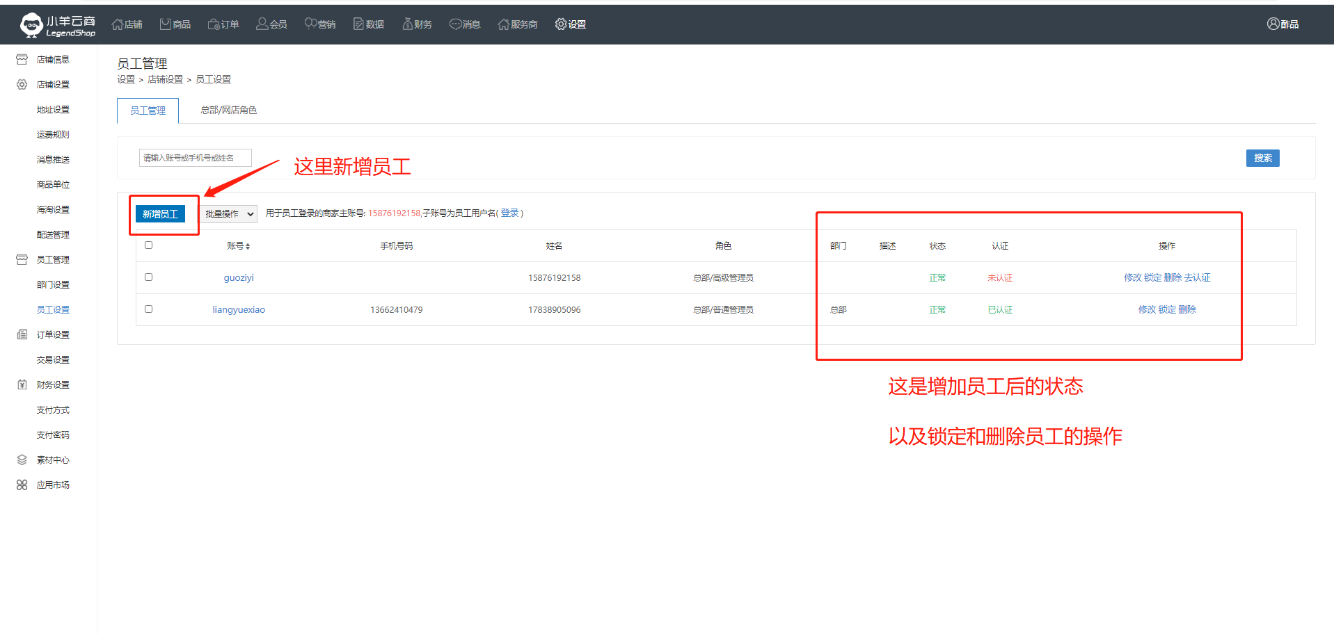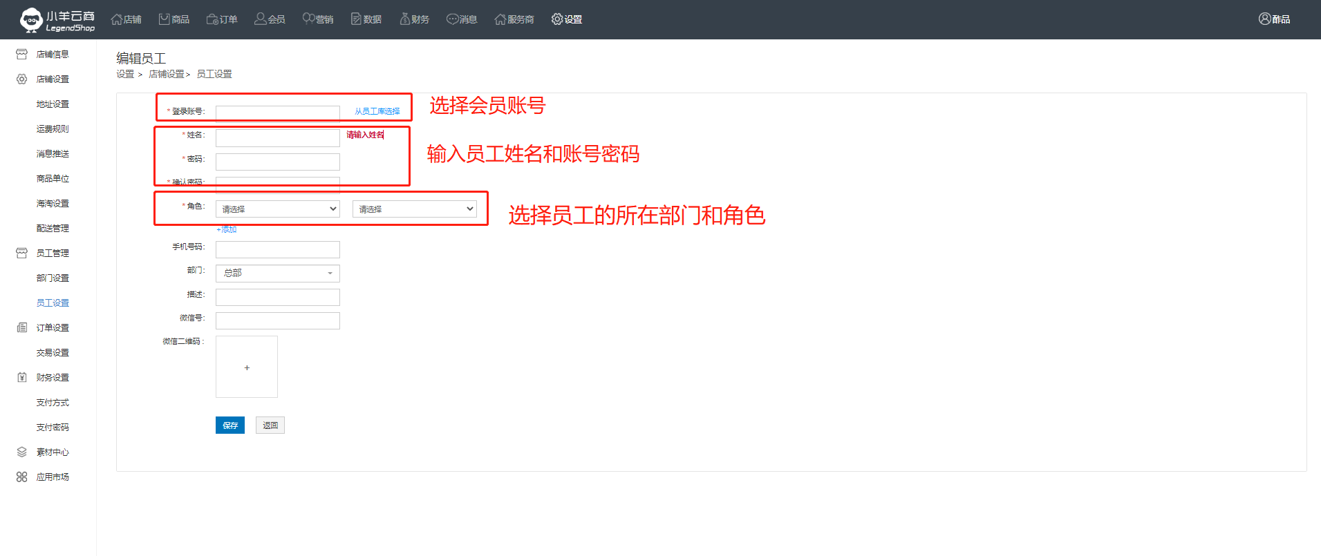 商家需要添加员工负责某个模块的内容时,添加员工后分配权限去管理和运营。