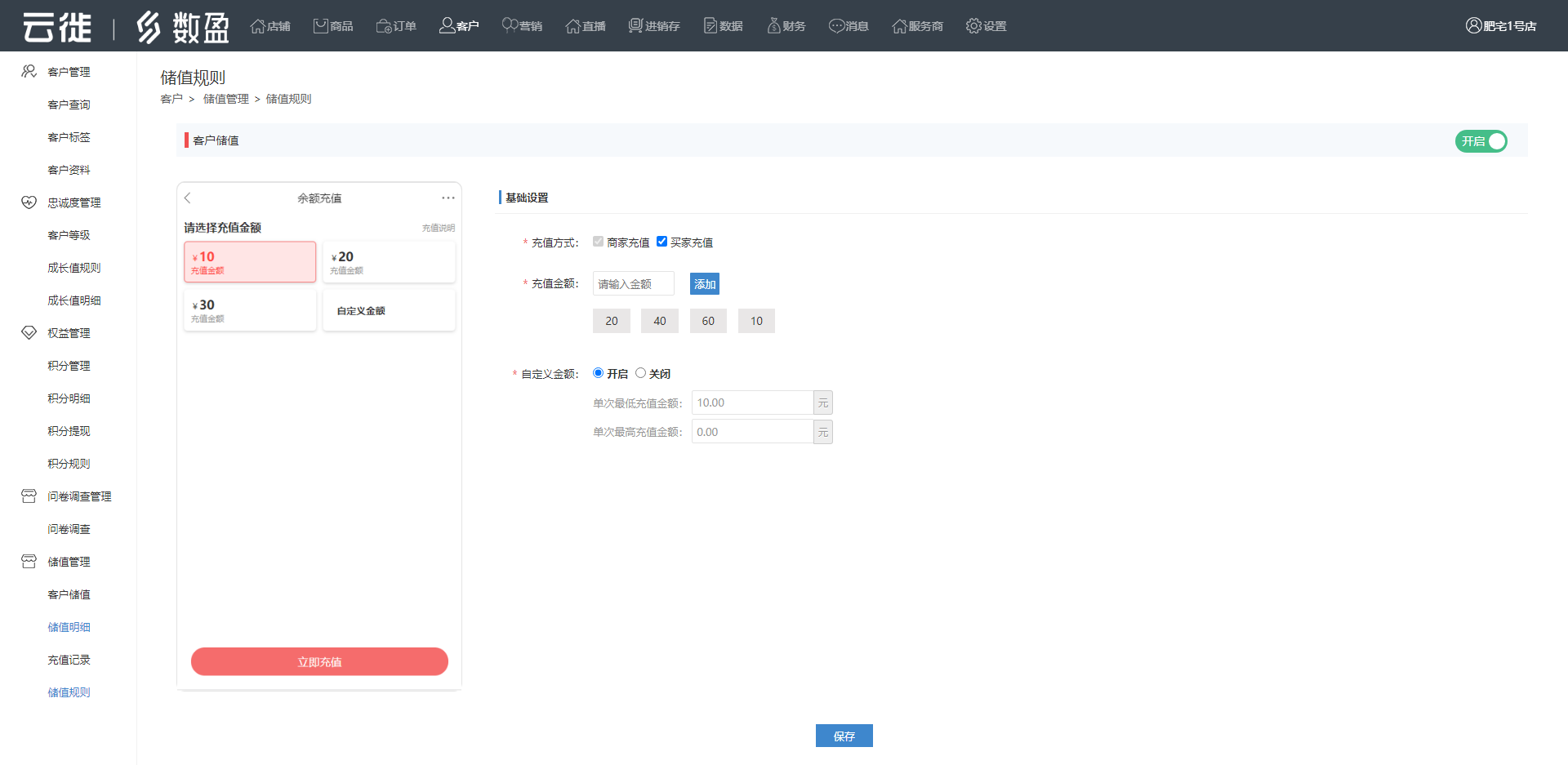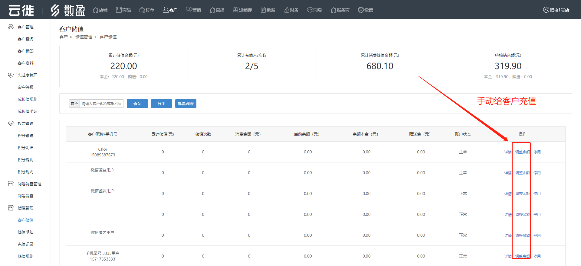 开启客户储值后,客户充进余额的钱可以用来支付,商家也可以后台调整客户余额。