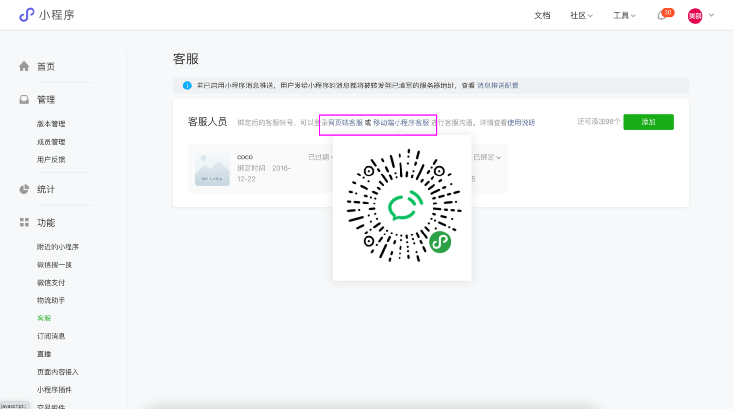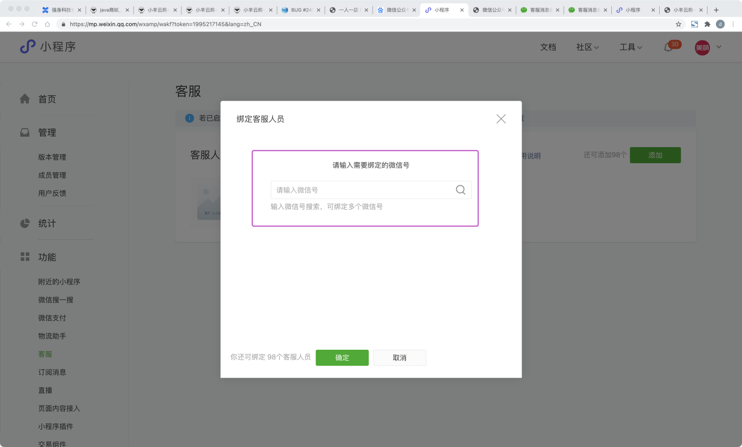 但是小程序的客服, 因为H5端没有, 所以我们就采用加入微信号的模式: