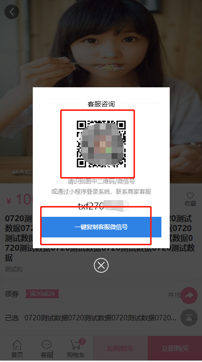 用户在移动端商品详情页的下方点击【客服】,弹出客服信息,可以直接复制联系方式也可以截图后通过扫一扫添加微信,与客服进行联系和沟通。