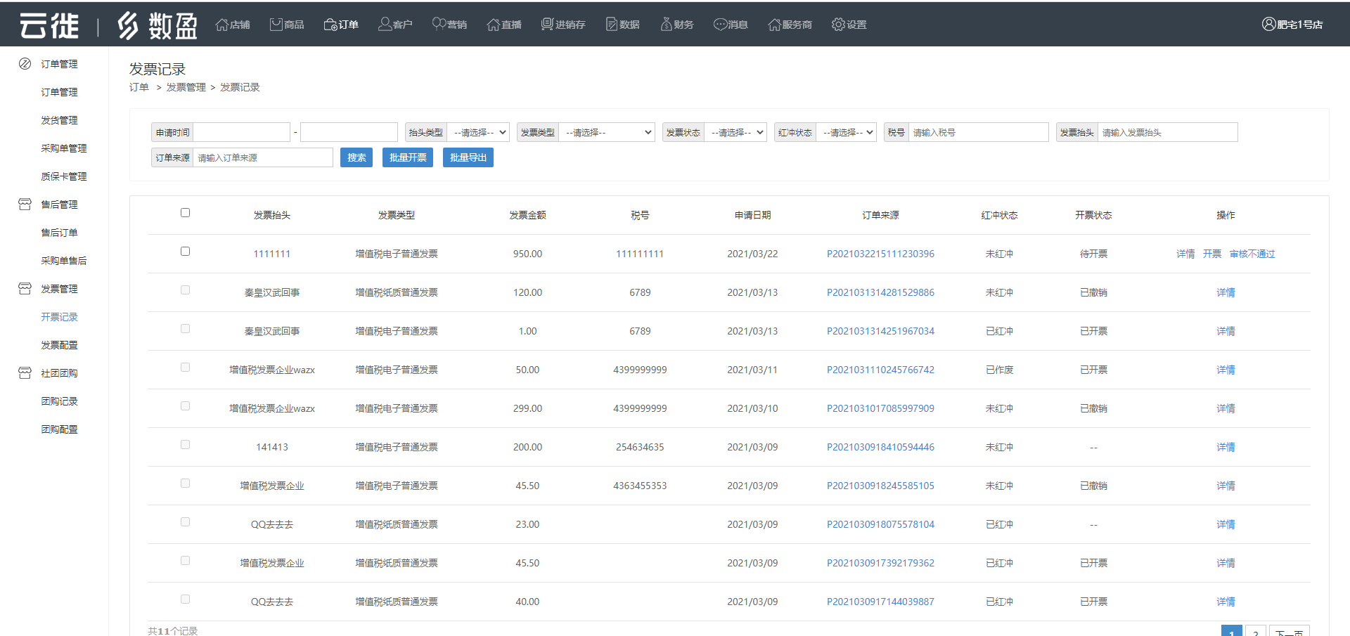发票功能有开关控制,开启发票开关,则用户可以向商家申请发票,商家端审核用户,线下开具;