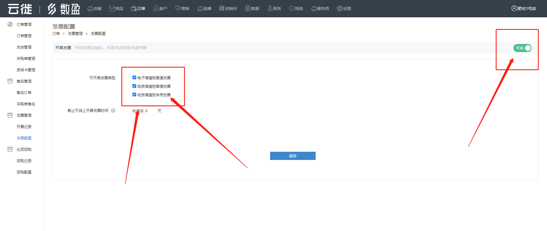 商家首先要在后台进行发票类型勾选,截止开发票时间的,将开关开启,这样用户下单或者在订单列表填写信息就可以进行申请。