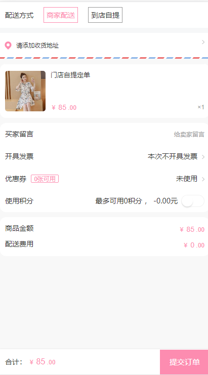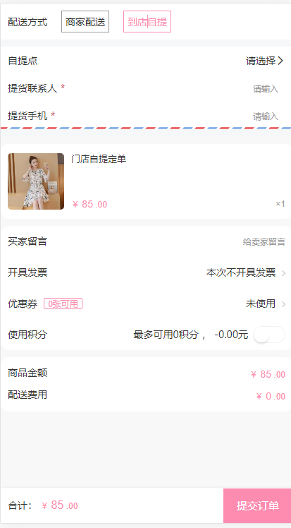 配送方式:物流配送和线下自提;商品发布是勾选对应的方式,购买的时候才会有对应可选择的方式。