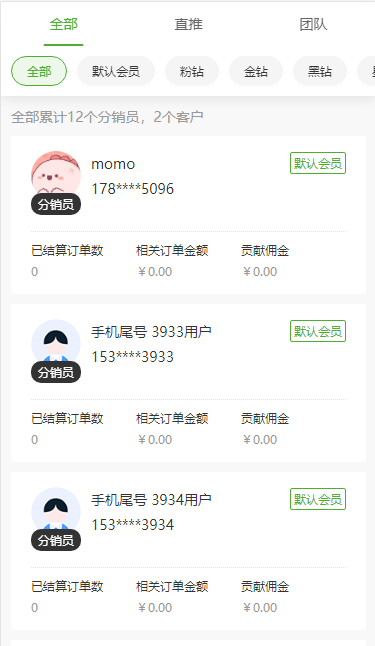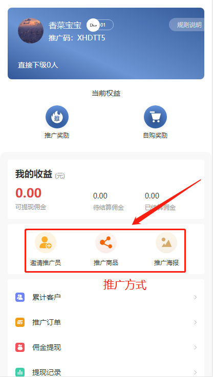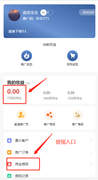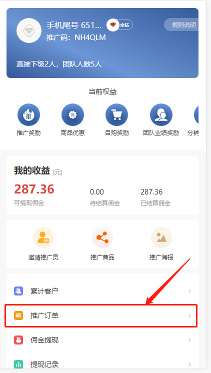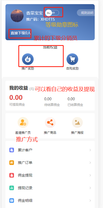 分销员【分销中心】可看到自己的等级、邀请码、权益、收益等。分销员可以在此页面查看自己的下级以及分销订单。