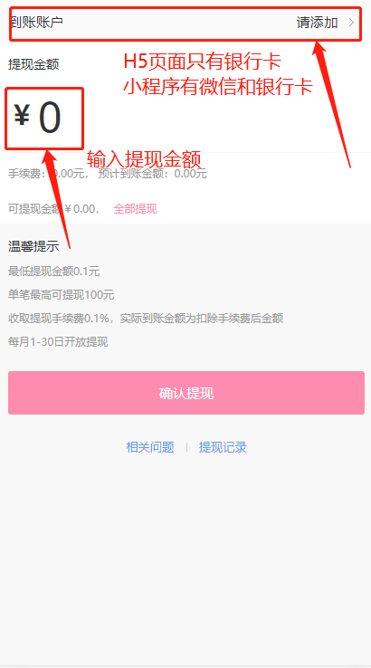 绑定成功后,可以按照操作进行提现申请。分销员申请提现需要向商家支付一定的服务费,费用在申请的金额内扣除,即实际到账的金额为扣除费用的之后的金额。