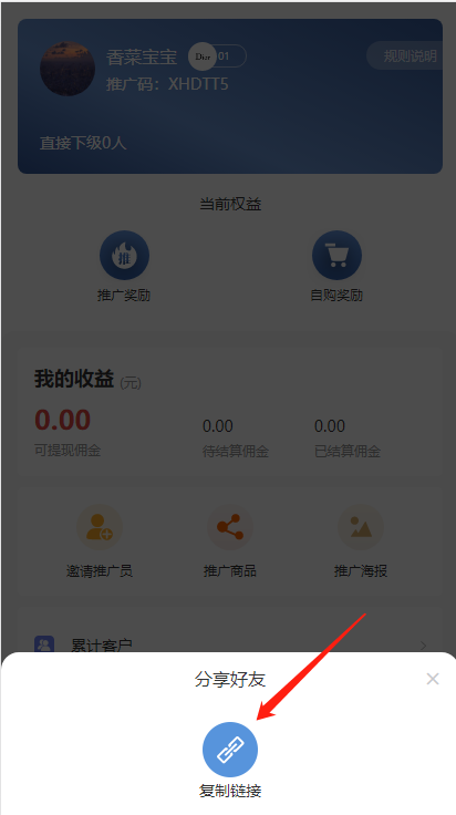 (1)邀请推广员:点击邀请→复制链接→发送给好友