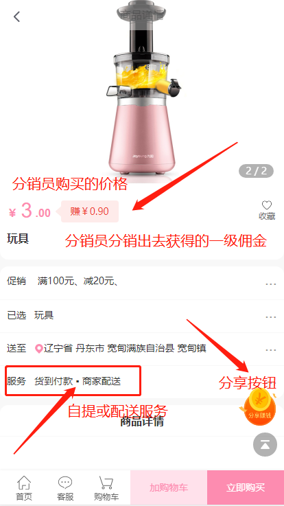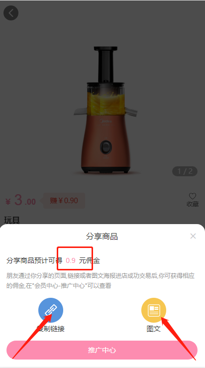 点击进入推广商品,显示的都是分销商品,进入商品详情,将商品以分享出去。如选择链接,则需要复制后粘贴给朋友,如是图片,则H5需要保存后发给朋友,小程序则可直接调用微信好友列表分享。