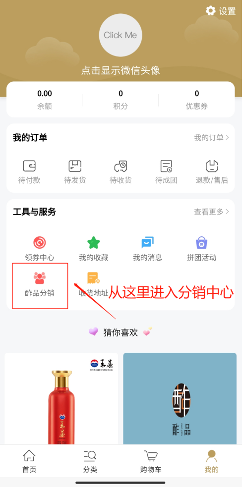 用户成功注册后进入【我的】→【分销中心】。