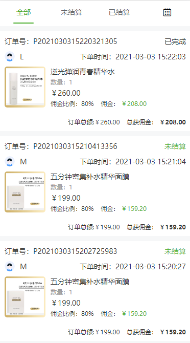 每个订单获得的明细、时间、获得佣金的多少