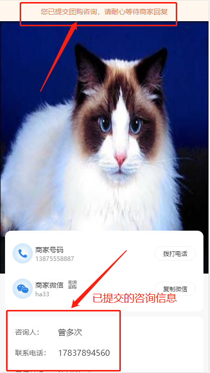 如需大批量团购商品,可以直接通过个人中心查看团购信息,并填入信息提交等待商家联系;或者可以通过页面上的手机号直接打电话,或者添加团购接待客服的微信进行咨询。