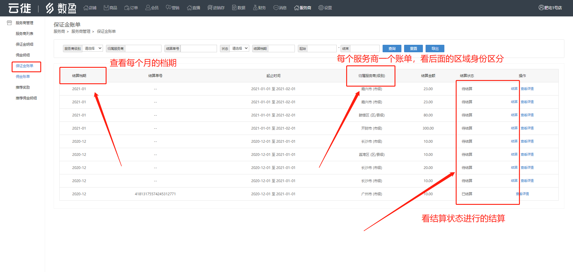 2、每月结算(保证金返还):点击保证金账单菜单→点击结算→导出报表