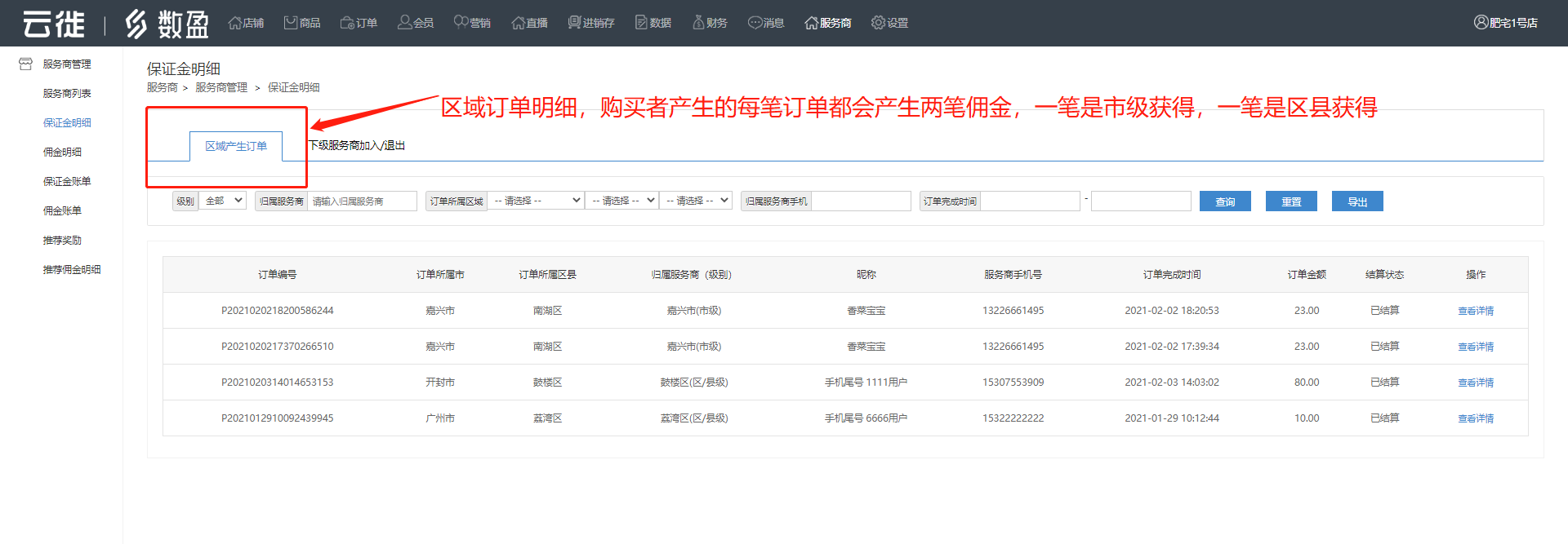 服务商模块产生的数据是在录入服务商之后,统计该地区服务商入驻之后产生的佣金数据订单数据,不可统计服务商加入之前的数据。