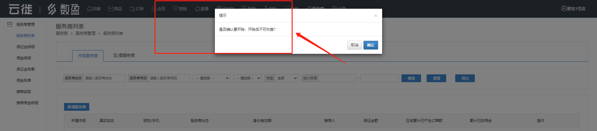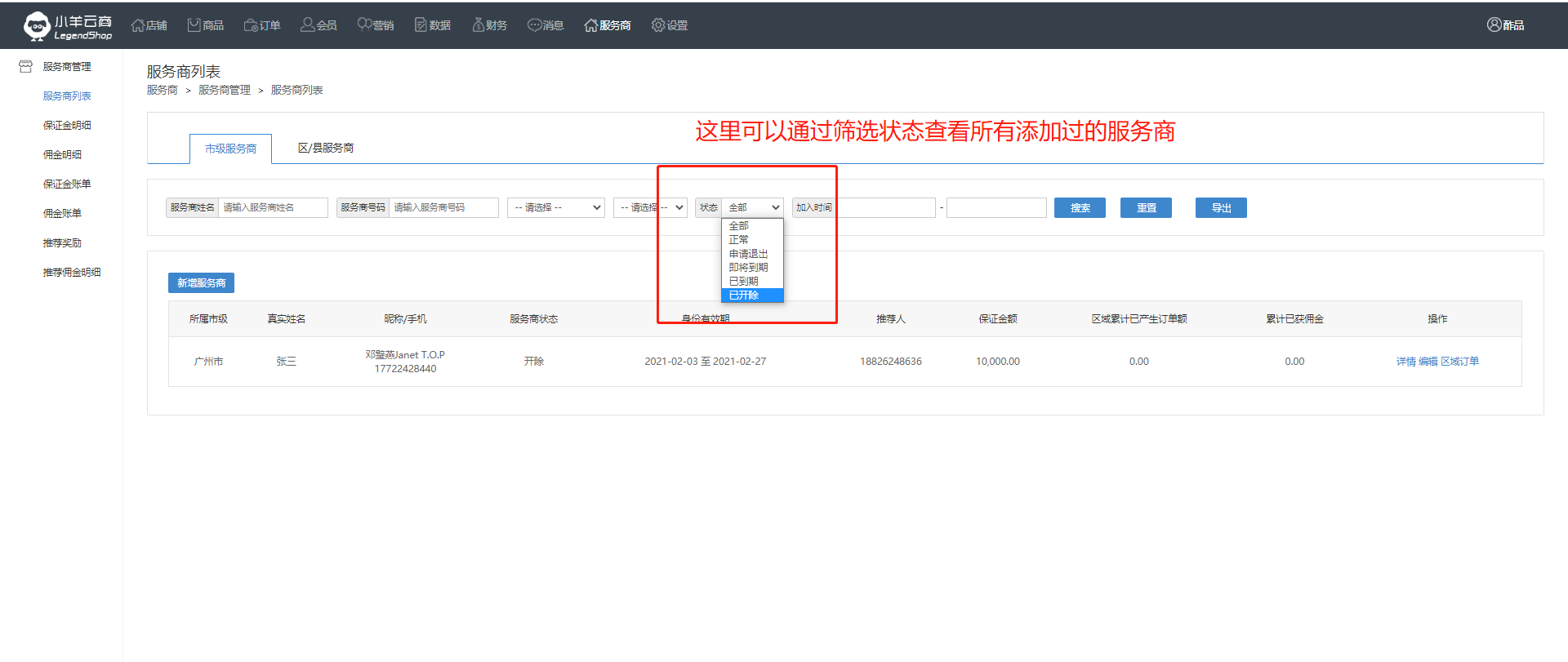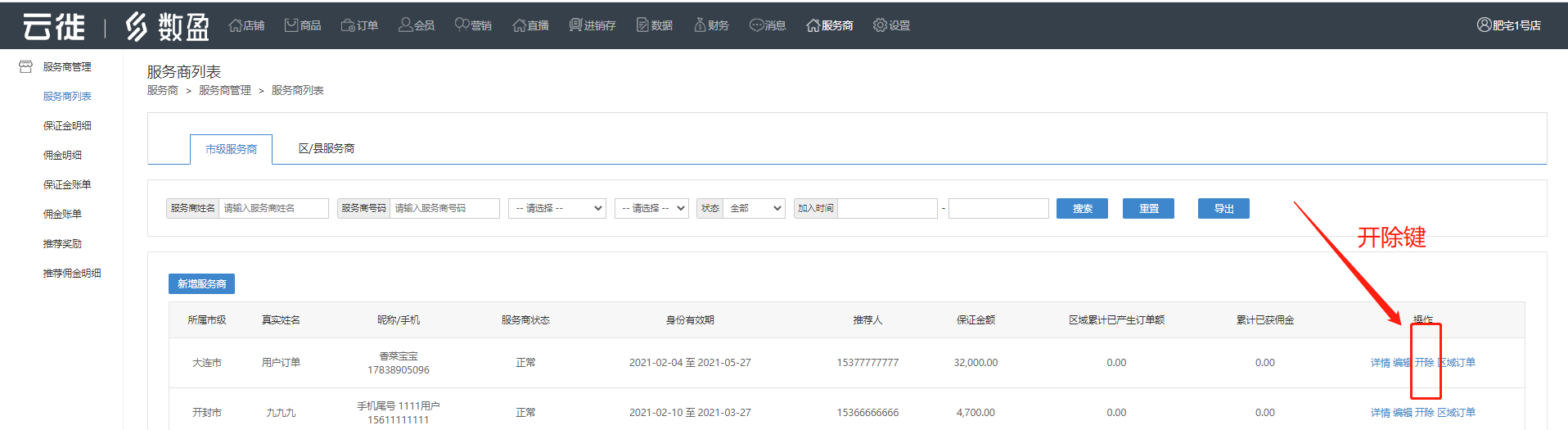 当有服务商申请终止合作不再担任服务商时;或是商家主动要开除服务商时,可以从服务商列表点击开除,开除后,该区域服务商可重新添加服务商进入,被开除的服务商已经产生的数据保存并截止在开除那一刻的数据。