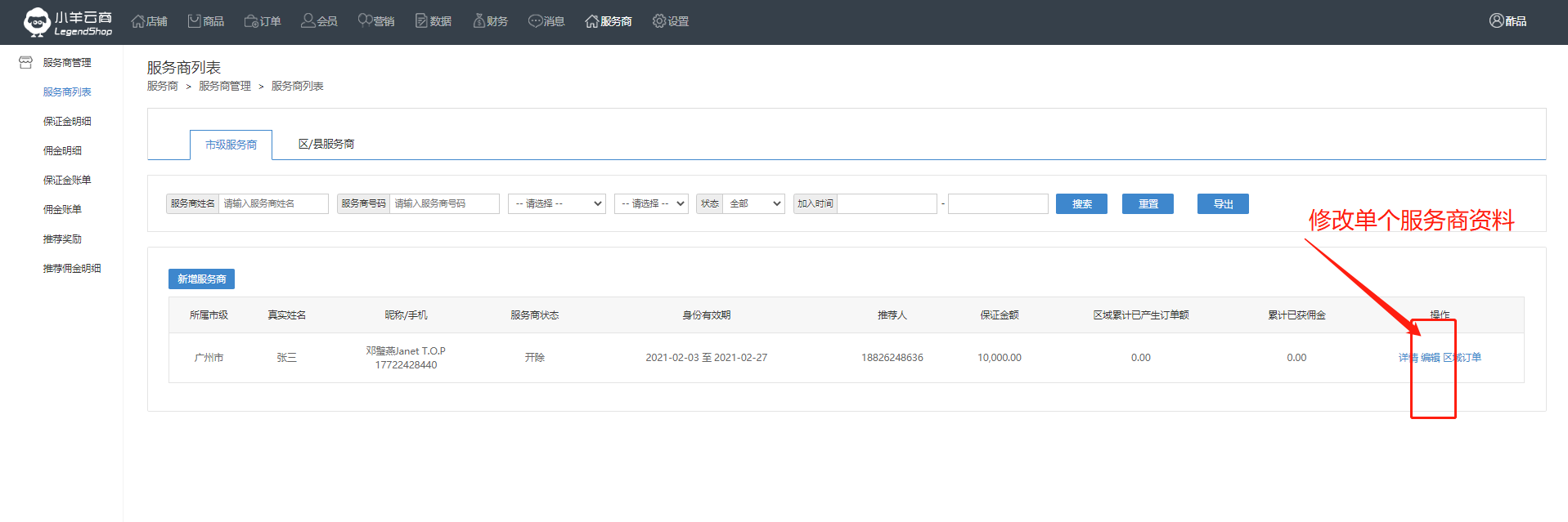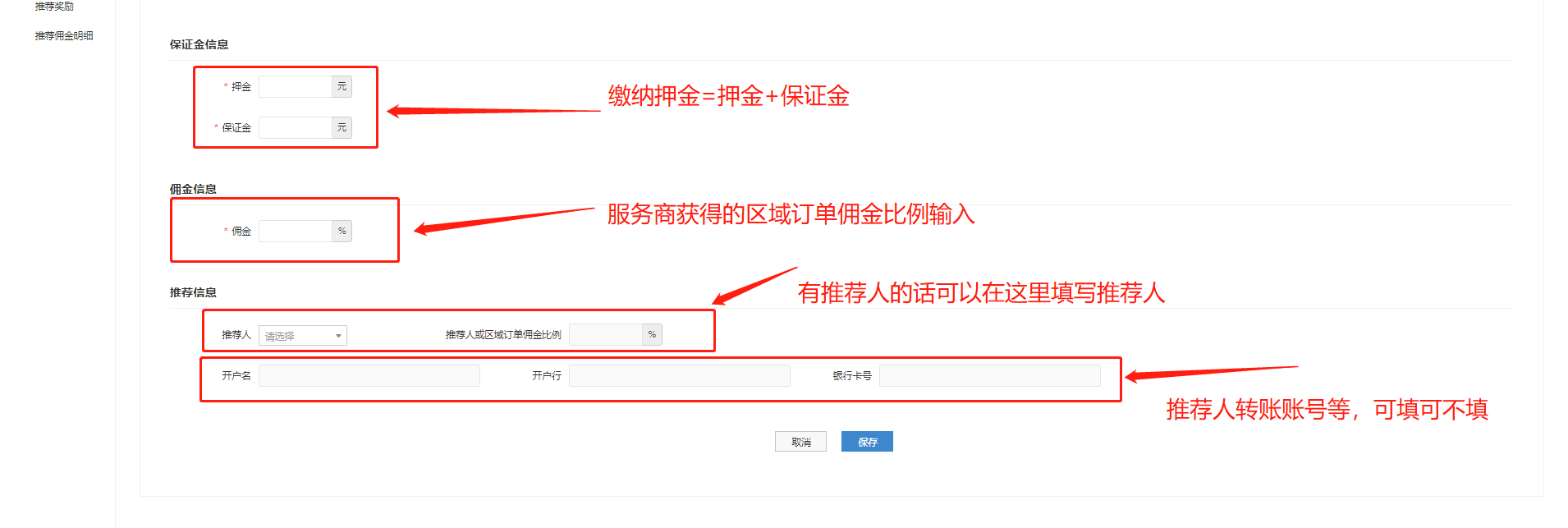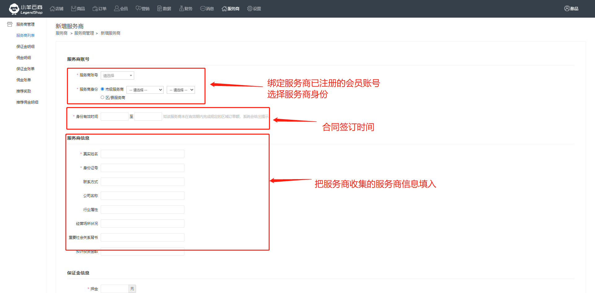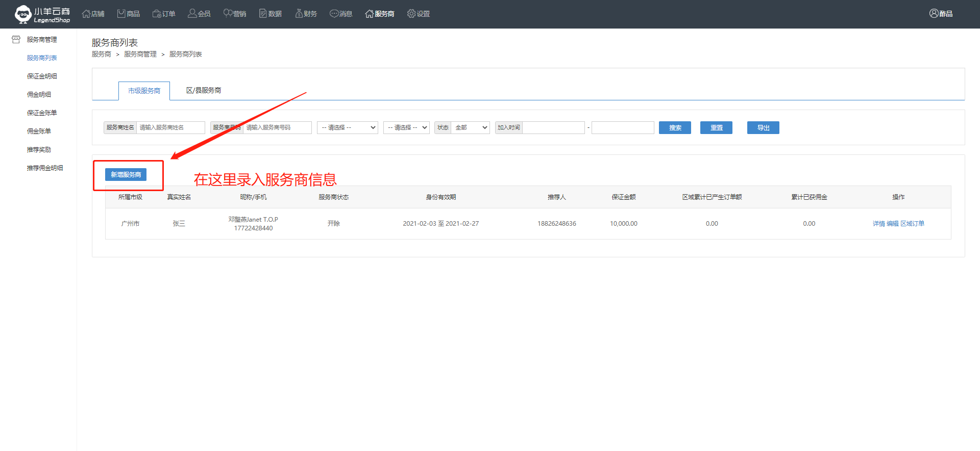 1、录入服务商:点击增加服务商→输入服务商绑定的会员账号→选择所属区域→填入服务商信息→填入押金保证金→设置服务商获取佣金比例→填入推荐人信息→提交保存。